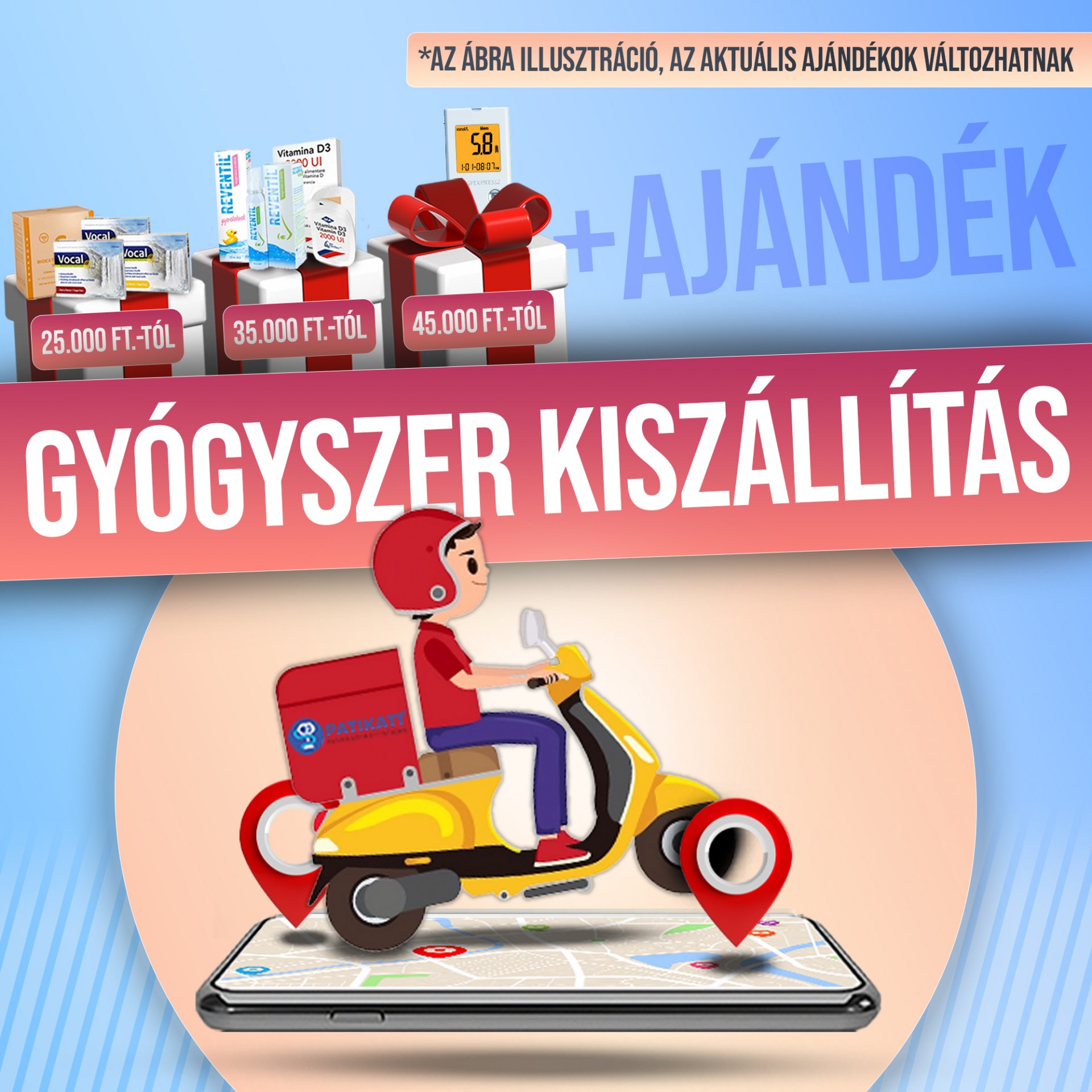 A gyógyszer kiszállítás szolgáltatásunk kényelmes megoldást kínál számodra, ráadásul most különleges ajánlatunkkal is élhetsz. Lehetőséged van választani az alábbi ajándékok közül, amennyiben 25.000 Ft felett rendelsz, és gyógyszer címkével ellátott termék is van a kosaradban.