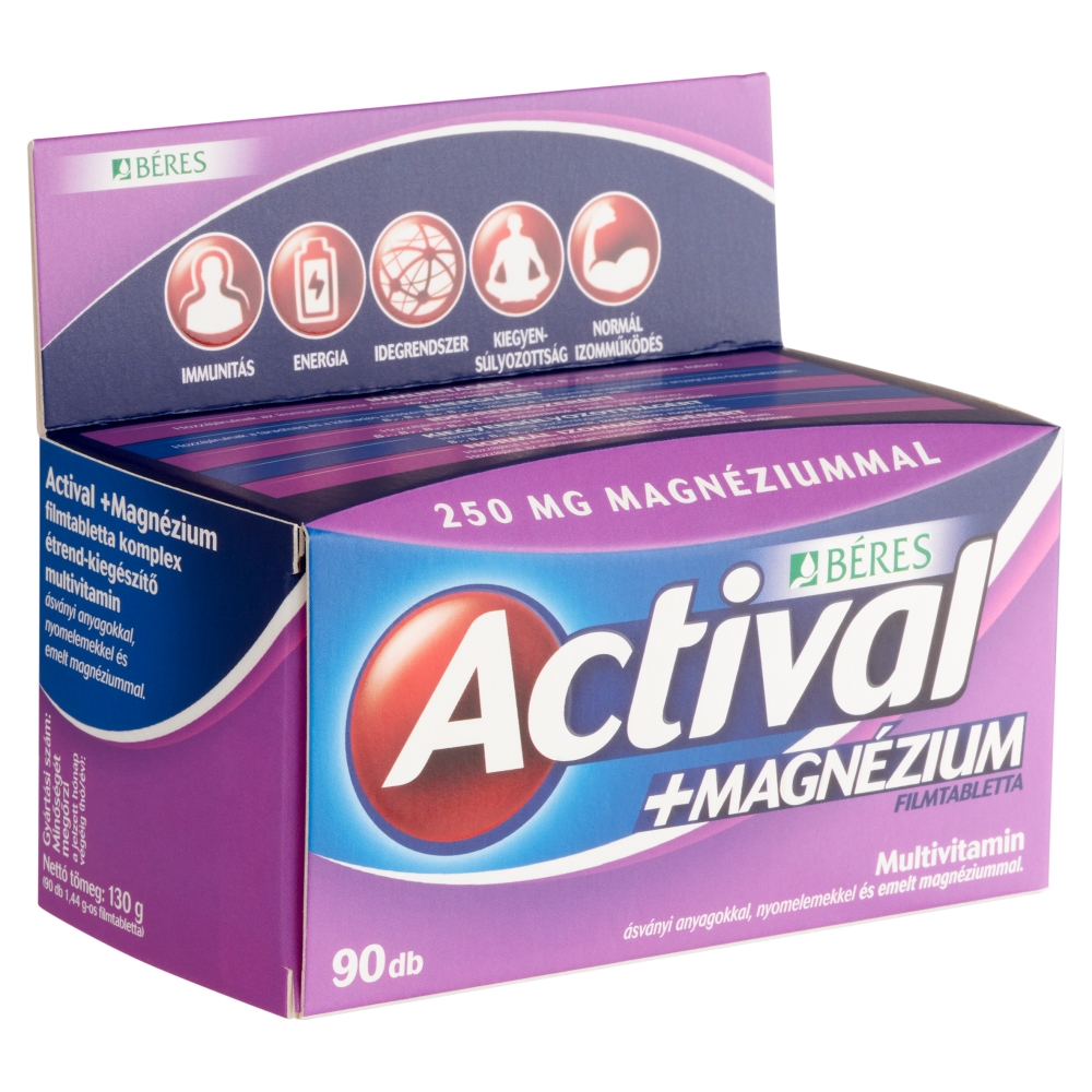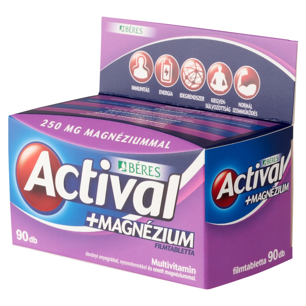 Actival +Magnézium filmtabletta komplex étrend-kiegészítő multivitamin ásványi anyagokkal, nyomelemekkel és emelt magnéziummal.