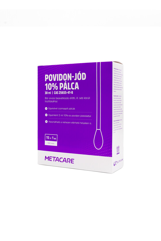 A Metacare Povidon-Jód 10% Pálca 2 ml 10%-os povidon-jód oldattal átitatott tamponpálca a METACARE-től. Használata rendkívül praktikus, hiszen a pálcika segítségével közvetlen az alkalmazási területre tudjuk felvinni a bőrtisztító oldatot. A METACARE orvostechnikai eszköze alkalmazható a célzott bőrfelület injekció, vérvétel, műtét előtti előkészítésére, valamint égési és horzsolásos sebek körüli bőrtisztításra. A doboz 15 db egyesével csomagolt tamponpálcát tartalmaz.