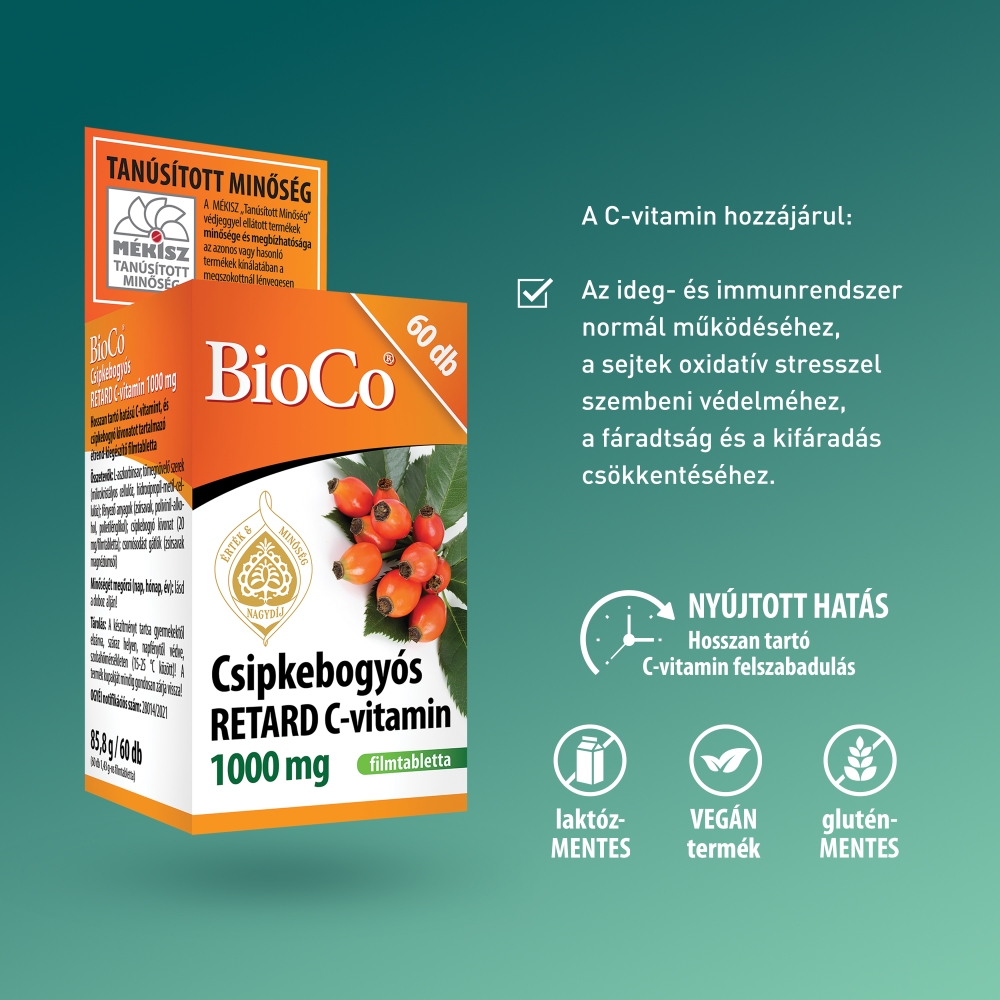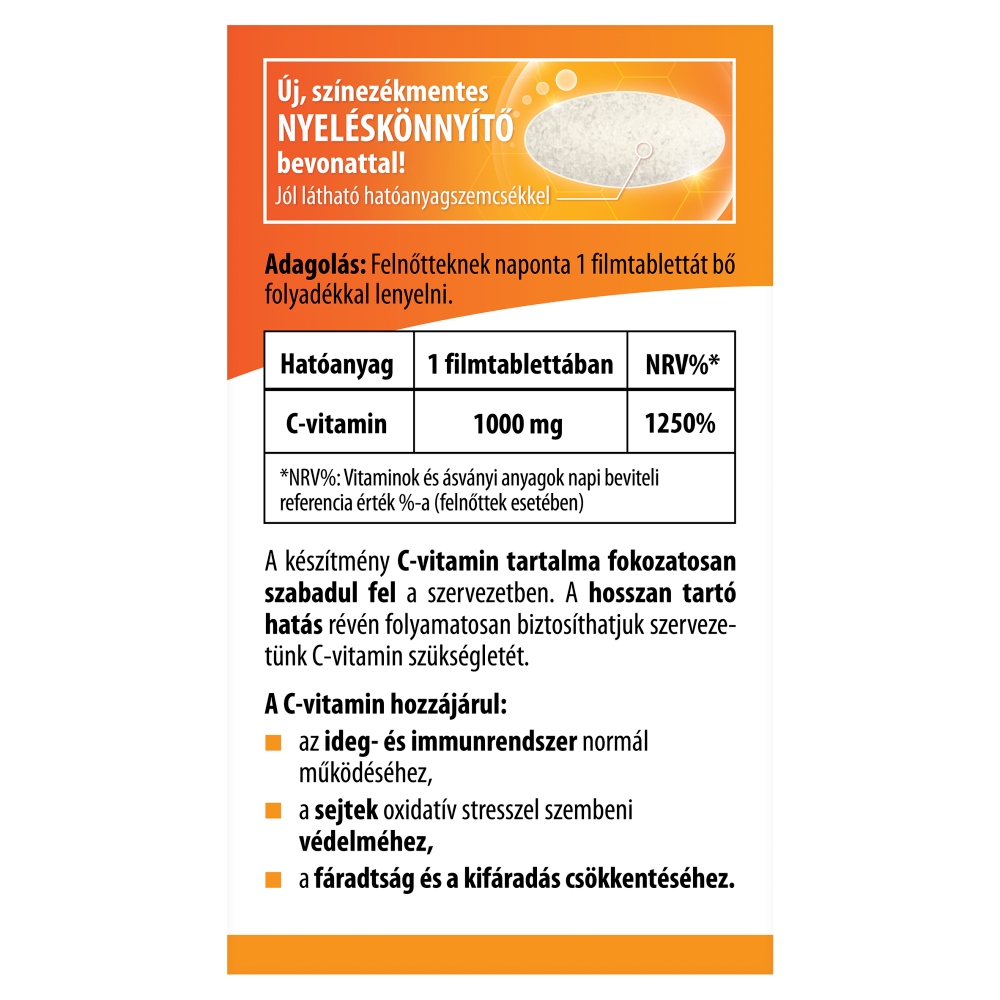 A készítmény C-vitamin tartalma fokozatosan szabadul fel a szervezetben. A hosszan tartó hatás révén folyamatosan biztosíthatjuk szervezetünk C-vitamin szükségletét.