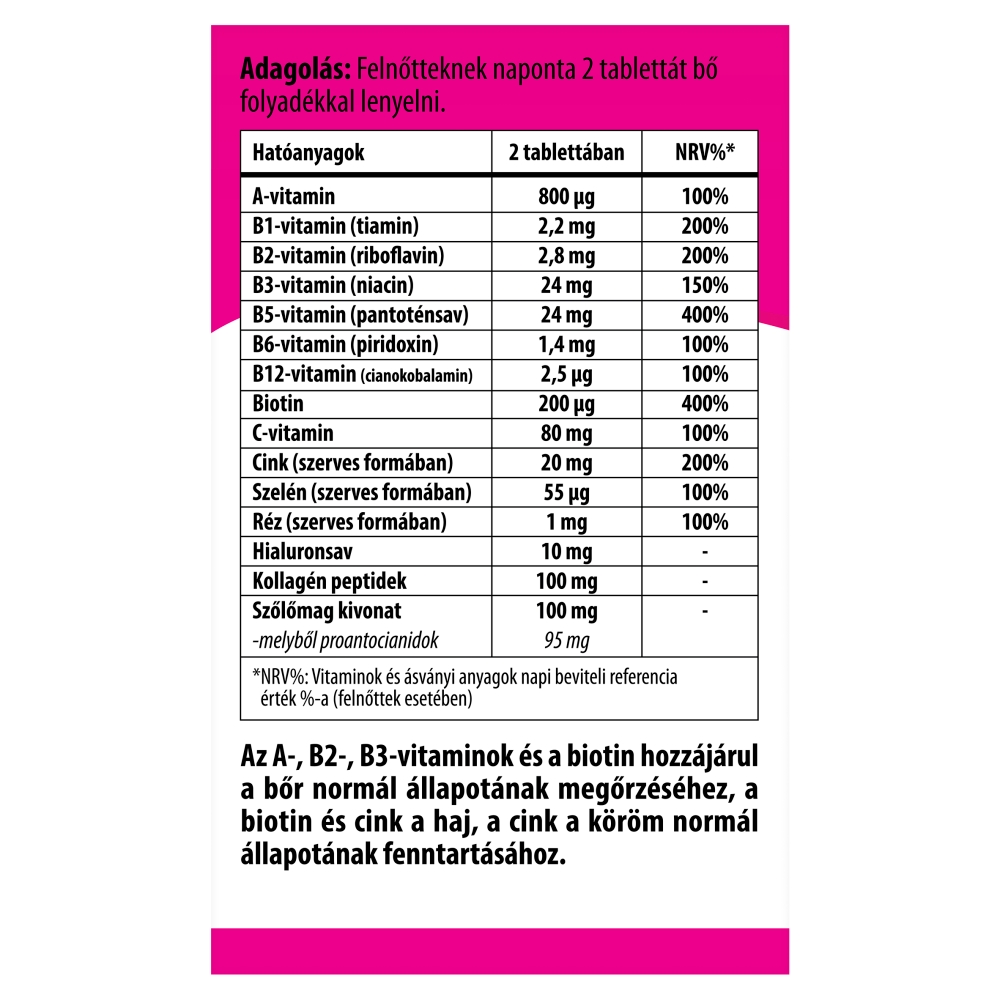 Tömegnövelő szer (mikrokristályos cellulóz), Maltodextrin, Kollagén peptidek, Szőlőmag kivonat, L-aszkorbinsav, Fényező anyagok (zsírsavak), Csomósodást gátló anyagok (talkum, szilícium-dioxid), Cink-citrát, Kalcium-D-pantotenát, Nikotinamid, Nátrium-hialuronát, Réz(II)-glükonát, Riboflavin, Tiamin-mononitrát, Piridoxin-hidroklorid, Retinil-acetát, D-biotin, L-szelenometionin, Cianokobalamin