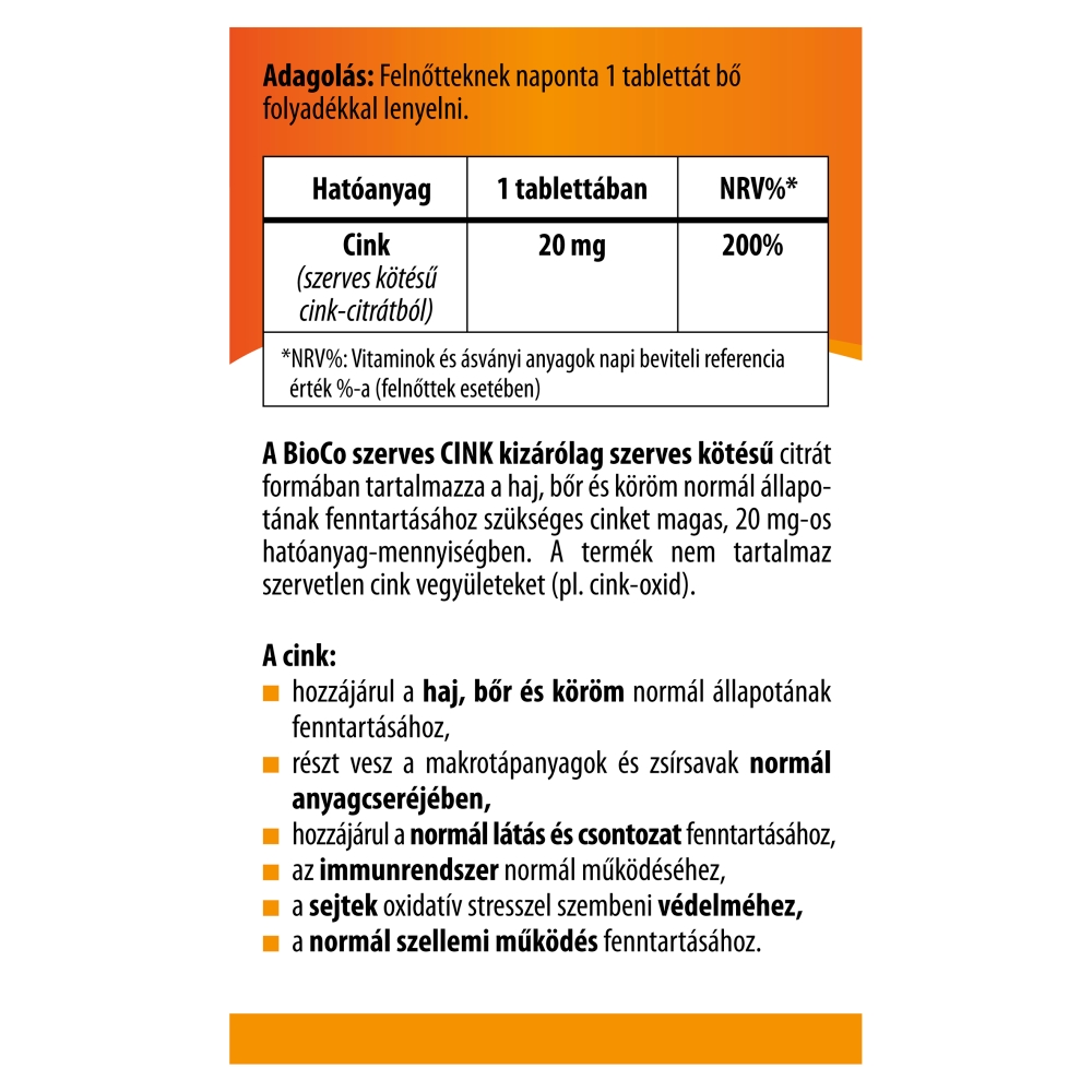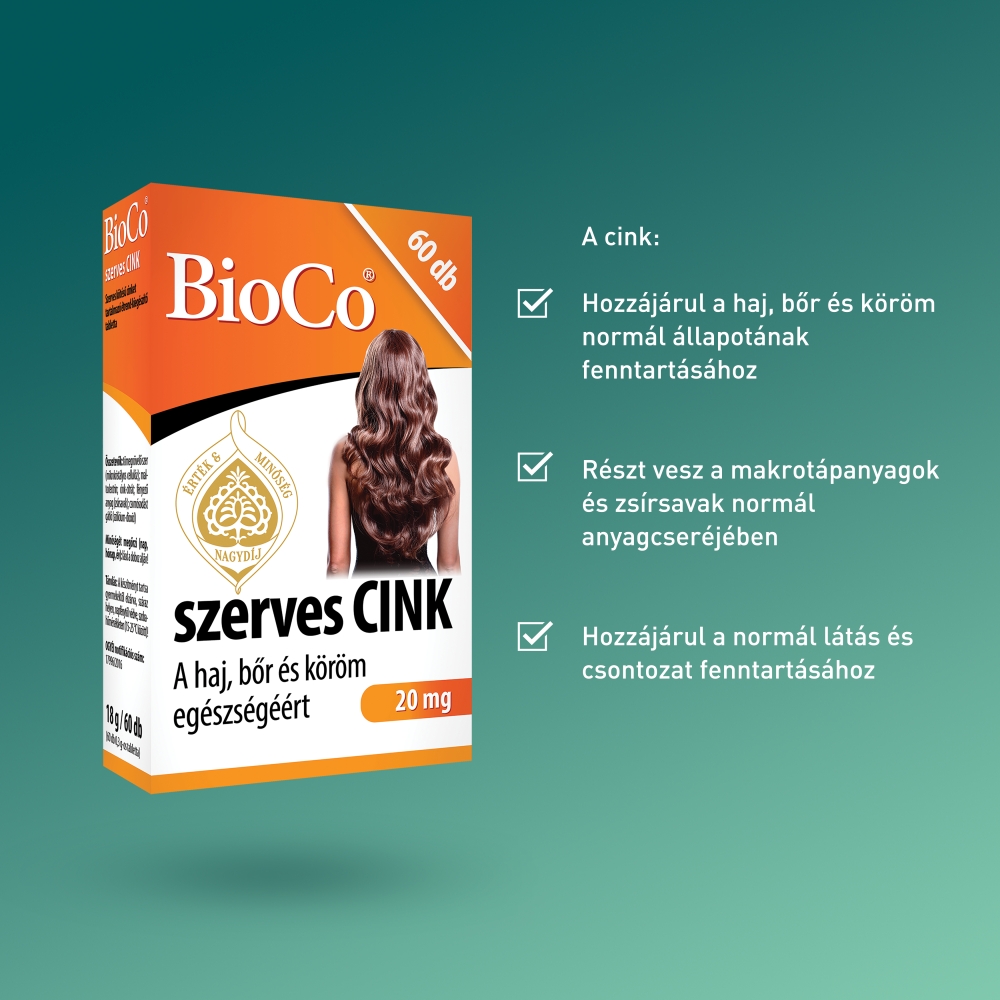A BioCo szerves cink kizárólag szerves kötésű citrát formában tartalmazza a haj, bőr és köröm normál állapotának fenntartásához szükséges cinket magas, 20 mg-os hatóanyag-mennyiségben. A termék nem tartalmaz szervetlen cink vegyületeket (pl. cink-oxid).