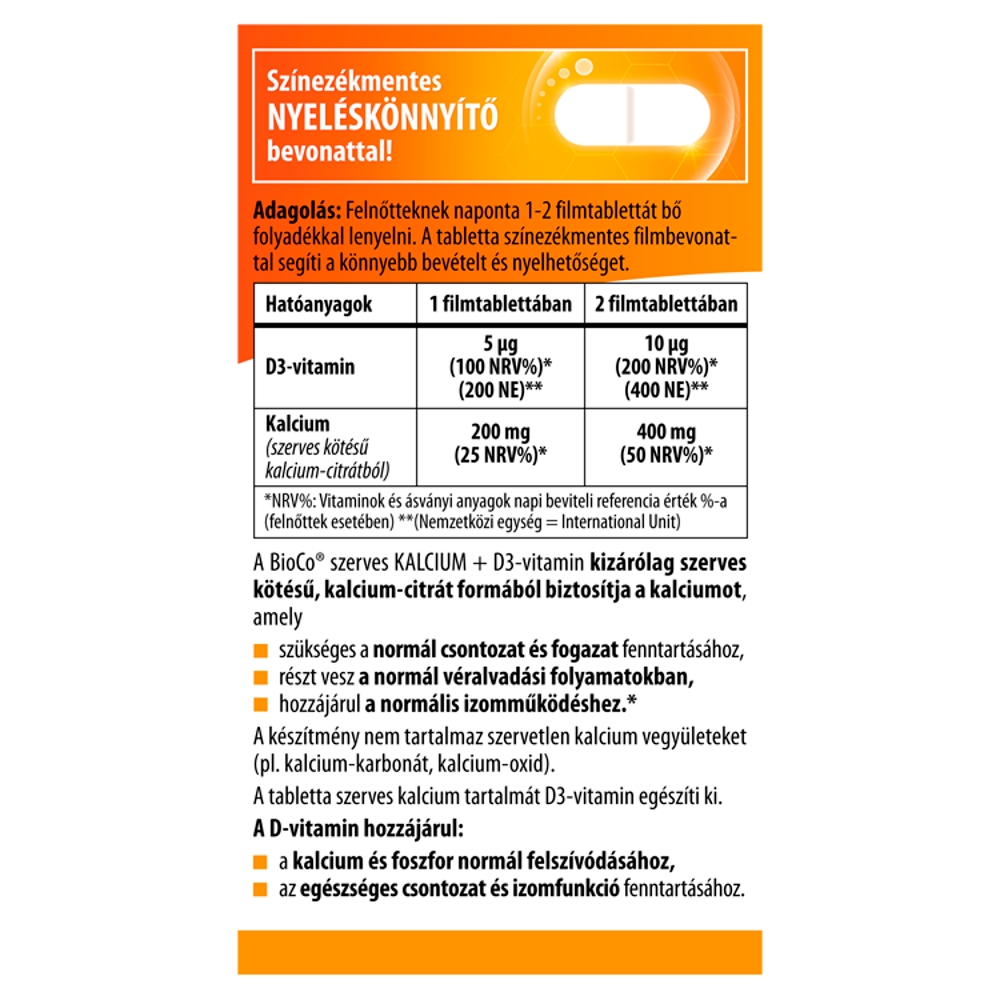 A tabletta szerves kalcium tartalmát D3-vitamin egészíti ki.