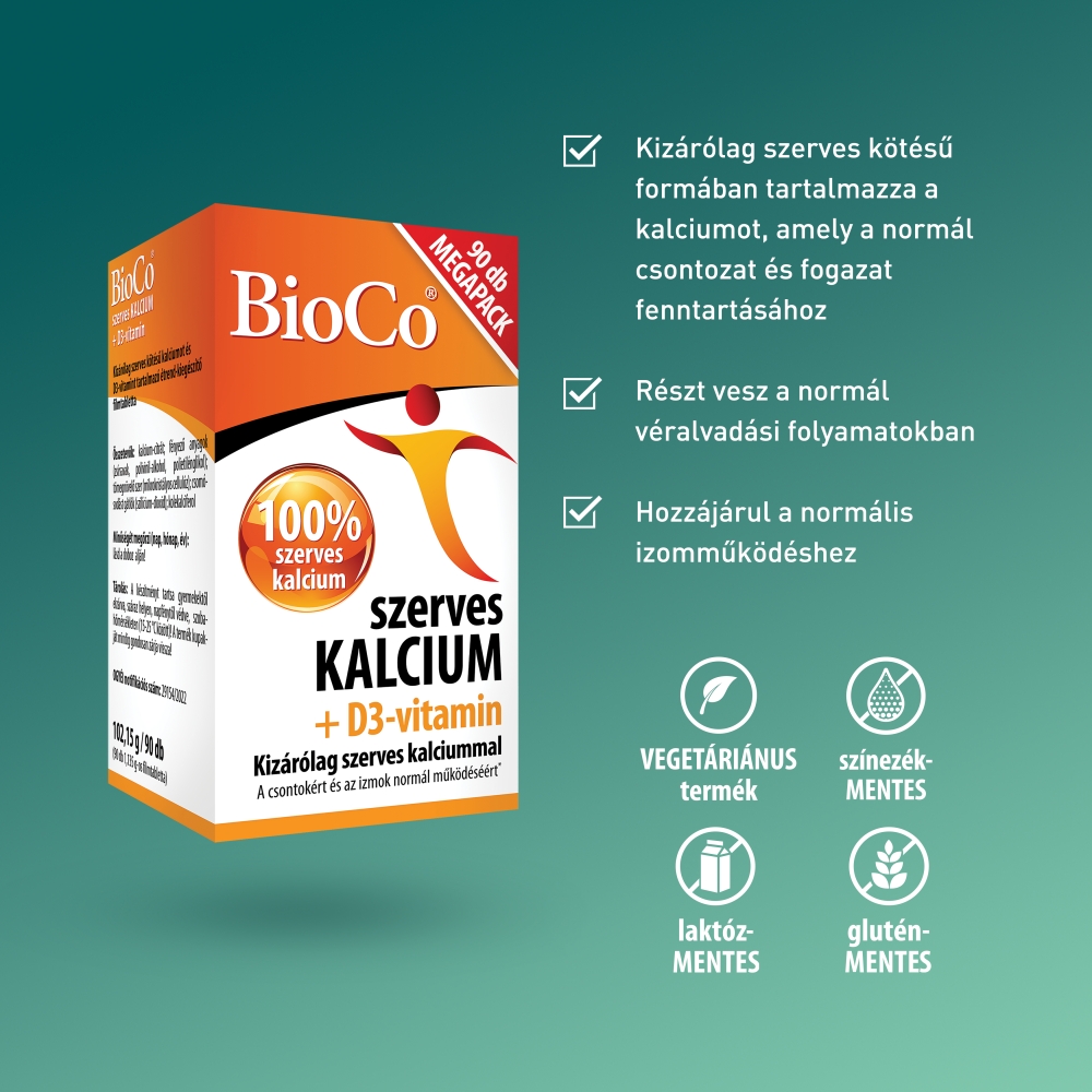 A BioCo szerves kalcium + D3-vitamin kizárólag szerves kötésű, kalcium-citrát formából biztosítja a kalciumot, amely