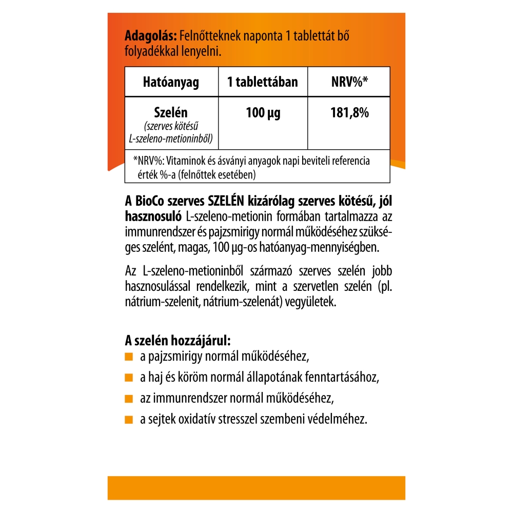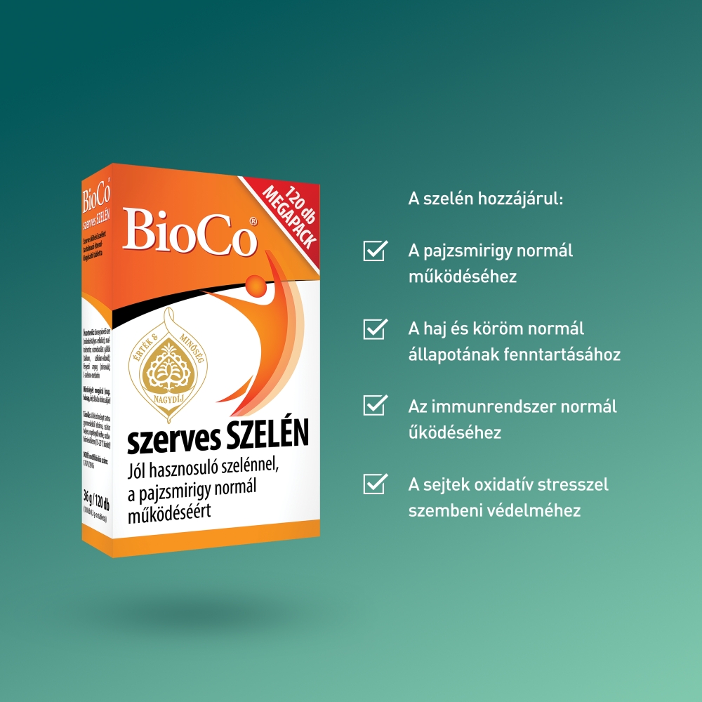 A BioCo szerves szelén kizárólag szerves kötésű, jól hasznosuló L-szeleno-metionin formában tartalmazza az immunrendszer és pajzsmirigy normál működéséhez szükséges szelént, magas, 100 ug-os hatóanyag-mennyiségben.