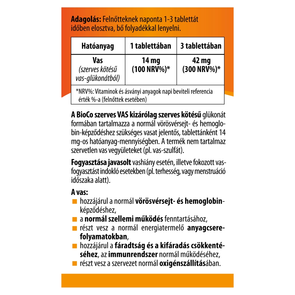 A BioCo szerves Vas kizárólag szerves kötésű glükonát formában tartalmazza a normál vörösvérsejt- és hemoglobin-képződéshez szükséges vasat jelentős, tablettánként 14 mg-os hatóanyag-mennyiségben. A termék nem tartalmaz szervetlen vas vegyületeket (pl. vas-szulfát).