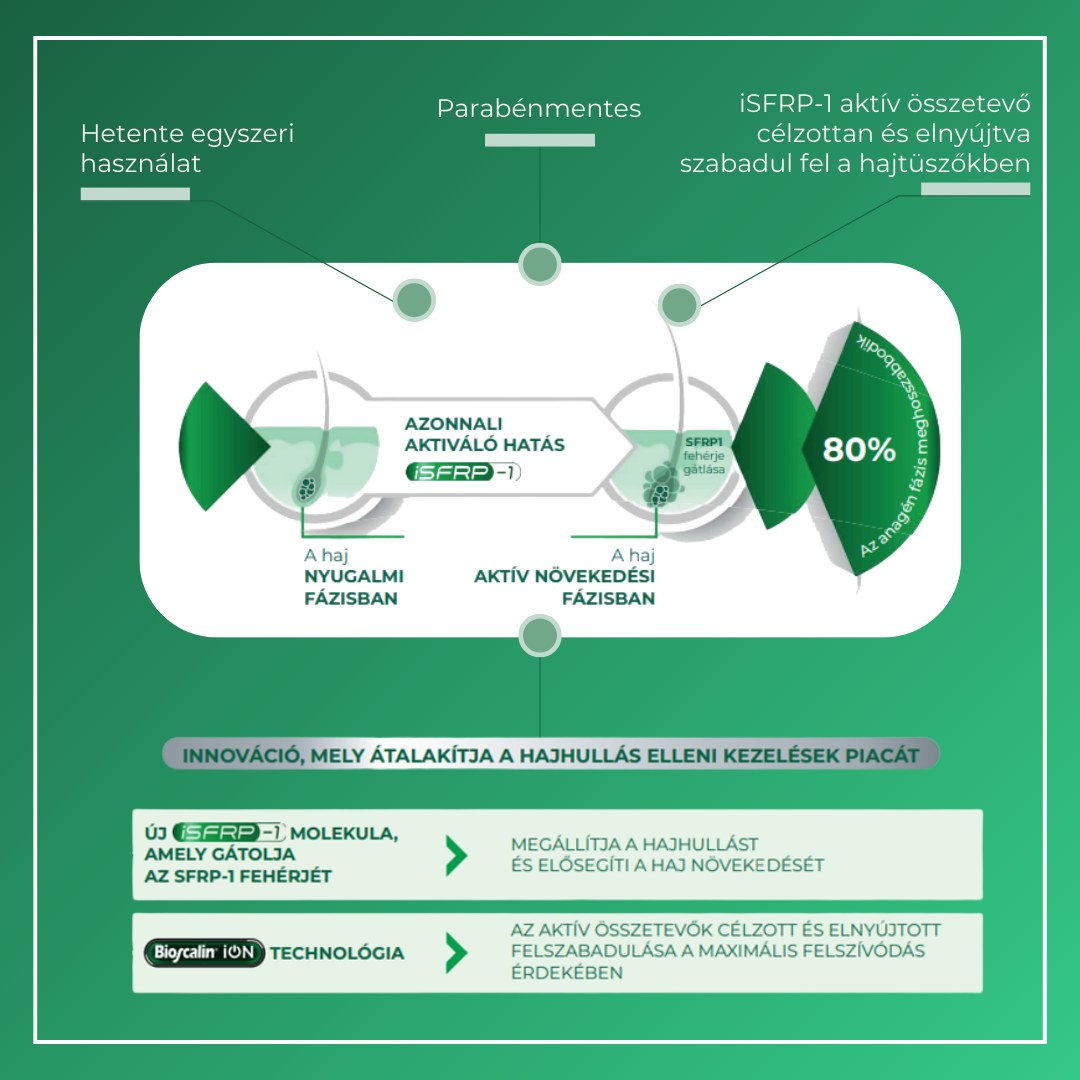 A Bioscalin Haj aktivátor iSFRP1 egy forradalmian új hajhullás elleni kezelés, amely az iSFRP-1 enzimet tartalmazza – a legújabb generációs hajerősítő molekulát. Szabadalmaztatott iON technológiájának köszönhetően az aktív összetevők célzottan jutnak el a hajtüszőkbe, ahol fokozzák a sejtek regenerációját és serkentik a hajnövekedést. Klinikailag bizonyított, hogy 1 hónap után a haj akár 80%-a növekedési fázisban van. Heti egy alkalmazás elegendő a látható eredményekért.