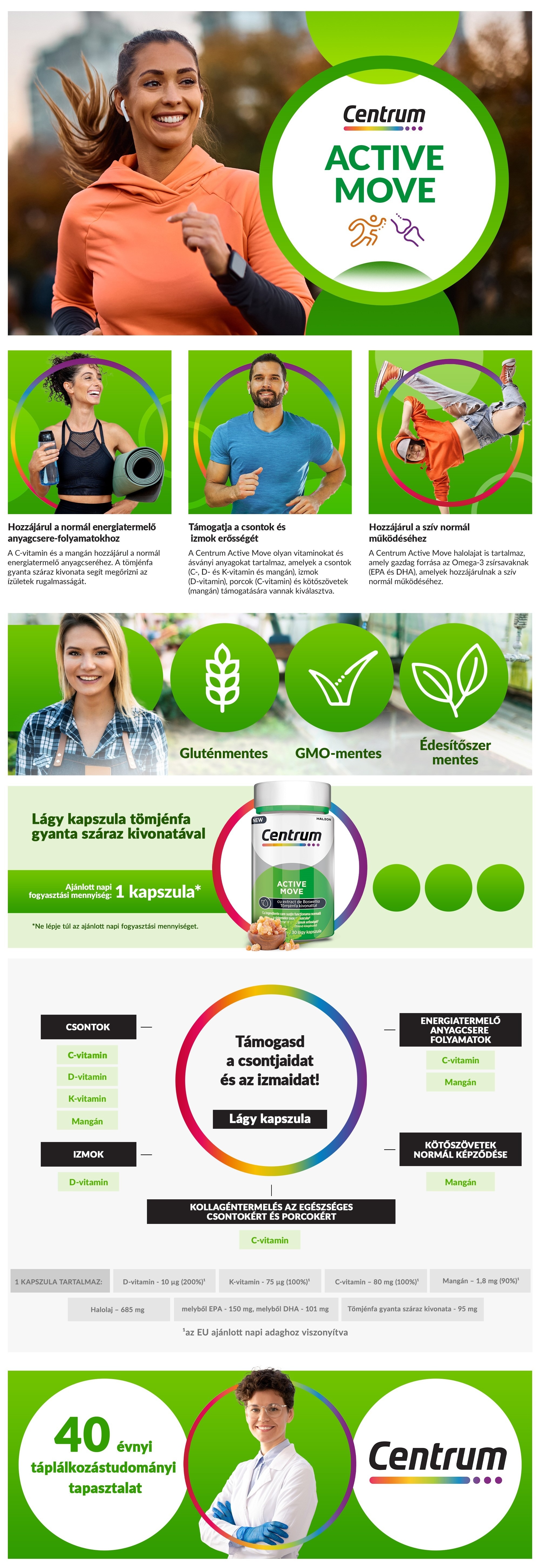 A Centrum Active Move egy felnőttek számára kifejlesztett étrend-kiegészítő, amely válogatott vitaminokat, mangánt, tömjénfa (Boswellia serrata) kivonatot, valamint EPA és DHA omega-3 zsírsavakban gazdag halolajat tartalmaz. Támogatja a csontok és izmok erősségét, valamint az ízületek rugalmasságát.
