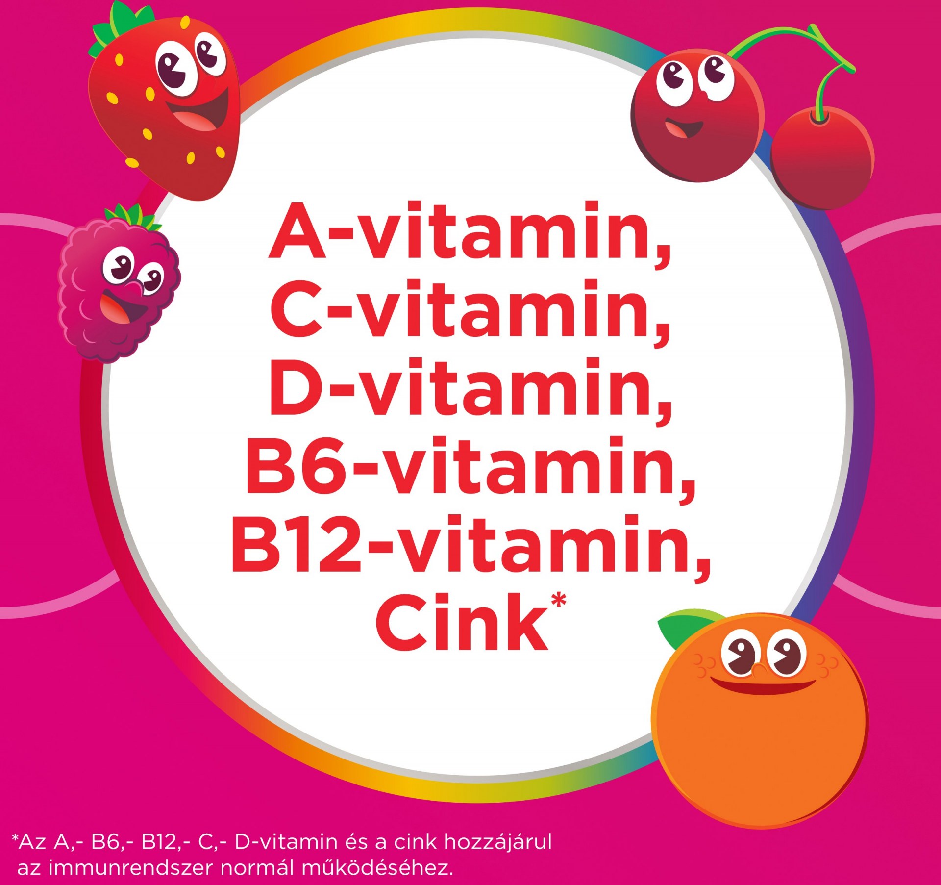 Glükózszirup, Cukor, Zselatin (marha), L-aszkorbinsav, Citromsav: E330, Nikotinamid, Maltodextrin, DL-alfa-tokoferil-acetát, Cink-szulfát, Természetes aroma (eper, málna), Növényi olaj (kókusz, repce), Színezékek (fekete répa és feketeribizli koncentrátum), Piridoxin-hidroklorid, Retinil-acetát, Fényezőanyagok: E903, E901, Kálium-jodid, D-biotin, Kolekalciferol, Cianokobalamin