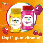 A Centrum Kids Gummies egy ízletes eper/málna ízű étrend-kiegészítő, amely vitaminokat és ásványi anyagokat tartalmaz, kifejezetten 3 éven felüli gyermekek számára. Támogatja a gyermekek egészséges növekedését és fejlődését, biztosítva a szükséges tápanyagokat a mindennapi élethez. Gyerek multivitamin.