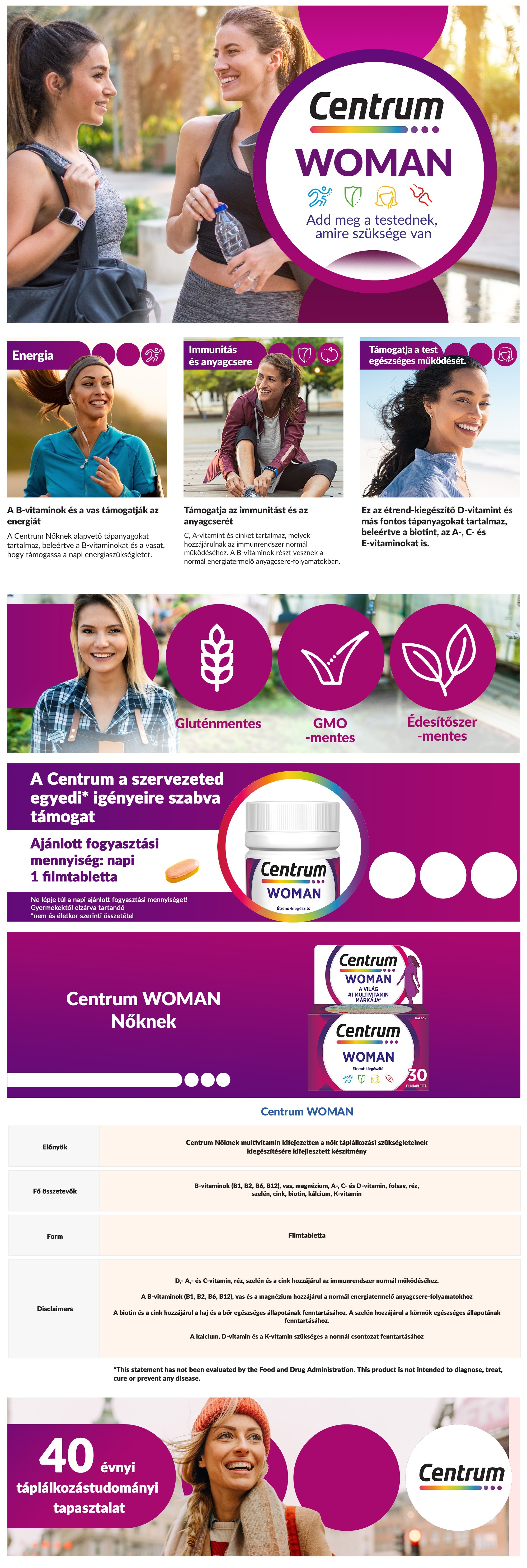 A Centrum Nőknek egy speciálisan nők számára kifejlesztett étrend-kiegészítő, amely vitaminok és ásványi anyagok széles spektrumát tartalmazza. Támogatja a vitalitást, az immunrendszer működését, valamint az egészséges haj, bőr, körmök és csontok fenntartását.