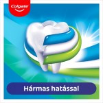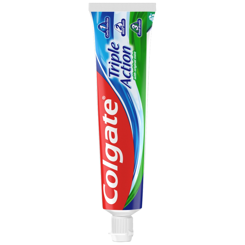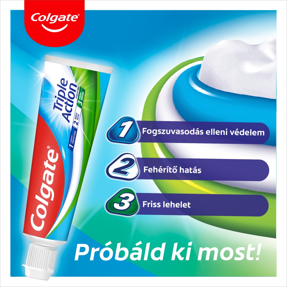 A Colgate Triple Action fogkrém mindennapos használata fluorid tartalmának köszönhetően hatékonyan akadályozza meg a fogszuvasodást, kitisztítja a szennyeződéseket a nehezen elérhető helyekről is. Ezeken felül pedig kiveszi a részét a fogfehérítésből is, hisz eltávolítja a felületi lerakódásokat. Eredeti mentát tartalmaz, így hosszan tartó friss leheletet biztosít. Ezt jelenti a Colgate Triple Action fogkrém hármas védelme. A fluorid beépül a fogba, erősíti, védi és fehéríti azt. Napi kétszeri fogmosás mellett is jó időre gondoskodhat a család fogainak védelméről és magabiztos mosolyáról általa. Fogsora tartós egészségéhez a napi minimum kétszeri fogmosás elvégzése ajánlott.