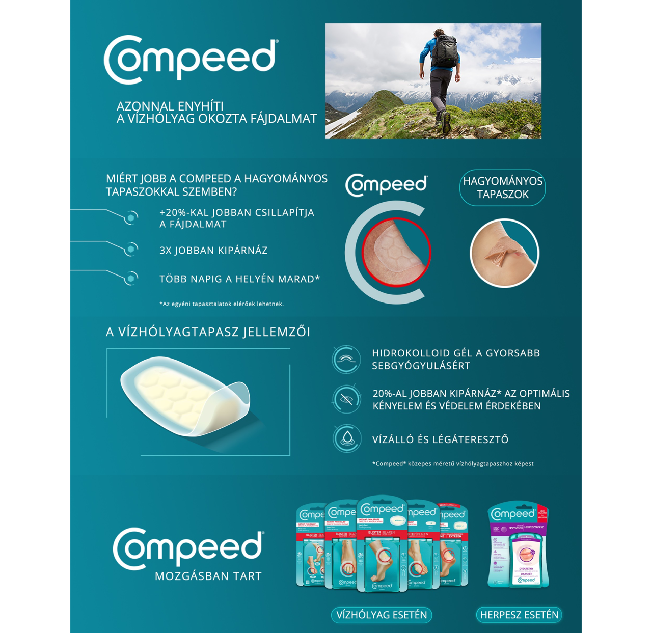 – Véd a kidörzsölés ellen, amikor leginkább szüksége van rá. Méhsejt szerkezetének köszönhetően, 20%-kal jobban párnáz, mint a Compeed® Medium Vízhólyagtapasz.