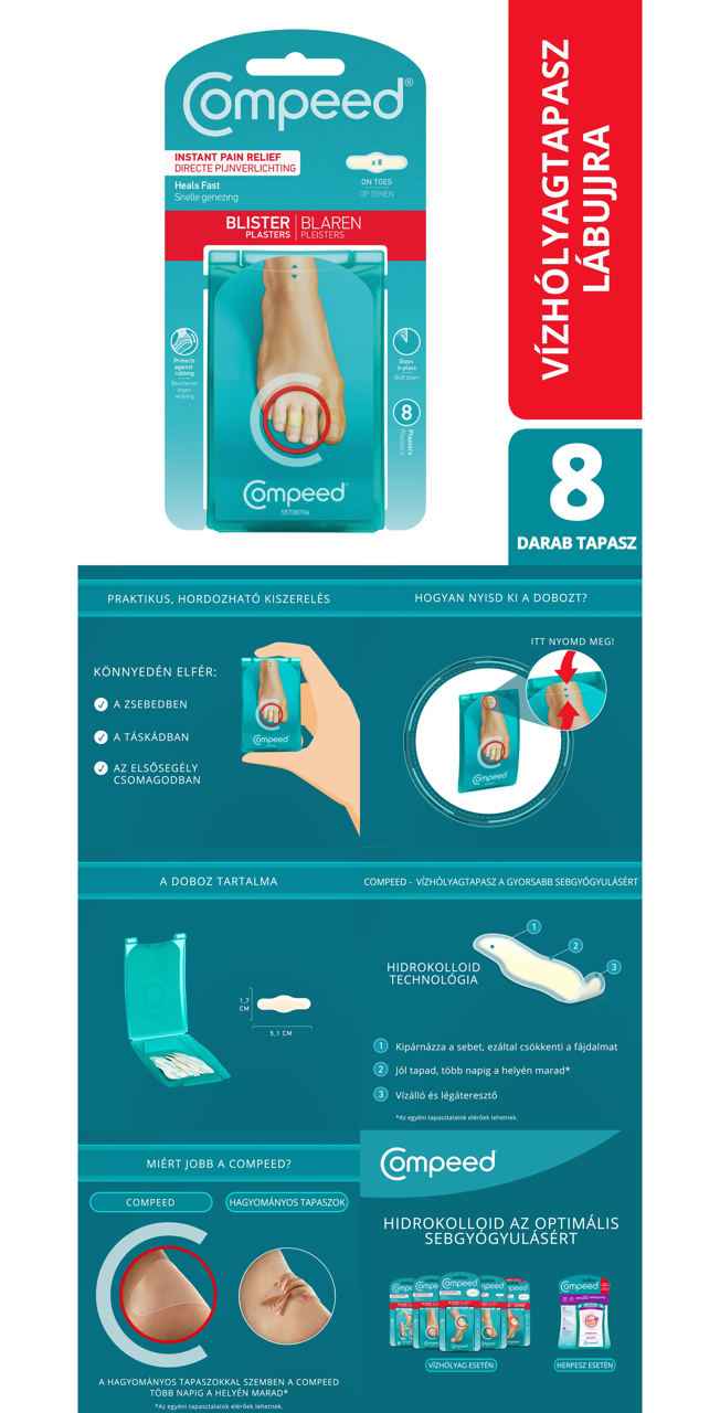 Compeed® hidrokolloid technológia egy aktív gél nedvszívó részecskékkel. A Compeed® tapasz úgy viselkedik, mint egy második bőr, ezáltal támogatja a természetes nedvességegyensúlyt:
