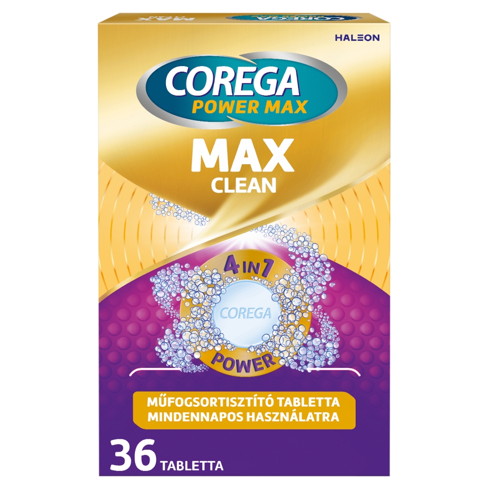 - Dobjon egy Corega Max Clean tablettát egy elegendő mennyiségű meleg, de nem forró vizet tartalmazó műfogsortartó dobozba vagy pohárba úgy, hogy a víz ellepje a teljes/részleges műfogsort.