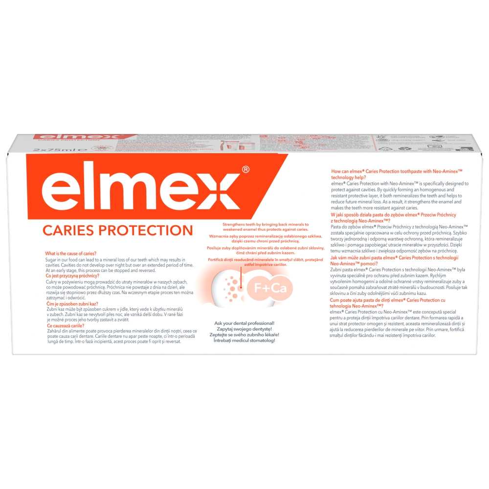 A kiemelkedően hatékony Neo-Aminex formulát tartalmazó elmex® Caries Protection fogkrémet kifejezetten a fogszuvasodás elleni védelem érdekében alkottuk meg. Hatékony védőréteget képez a fogak körül, amely remineralizálja a fogakat és segít ásványianyag-tartalmuk csökkenésének megelőzésében. Ezáltal erősíti a fogzománcot és ellenállóbbá teszi a fogakat a fogszuvasodással szemben. Fogszuvasodás elleni fogkrém továbbfejlesztett Neo-Aminex formulával.