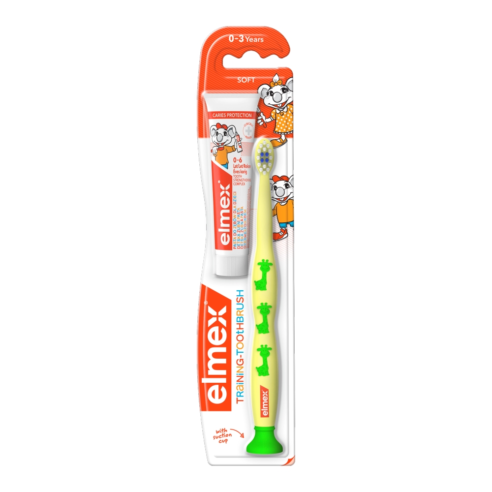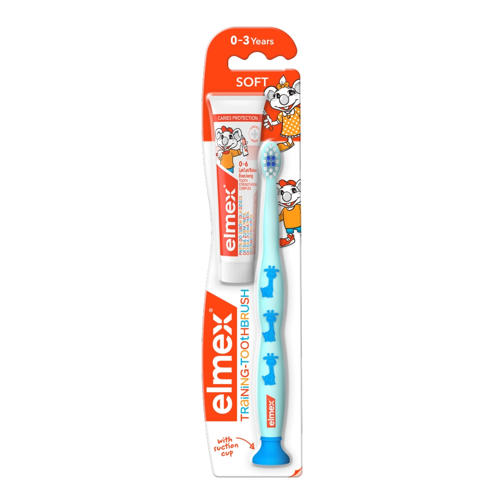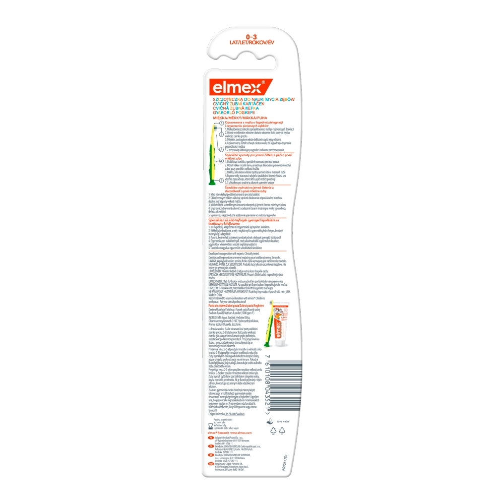 Elmex puha gyakorló fogkefe 0-3 éves gyermekeknek, speciálisan az első tejfogak gyengéd ápolására és tisztítására fejlesztve.