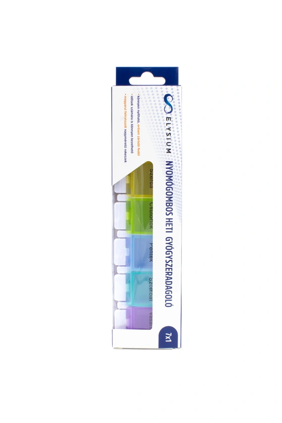 Az Elysium Nyomógombos Heti Gyógyszeradagoló a hét minden napjára különböző színű rekesszel rendelkezik megkönnyítve a heti gyógyszeradag kiosztását. Az erősen záródó rekeszek a nyomógomb segítségével nyílnak.