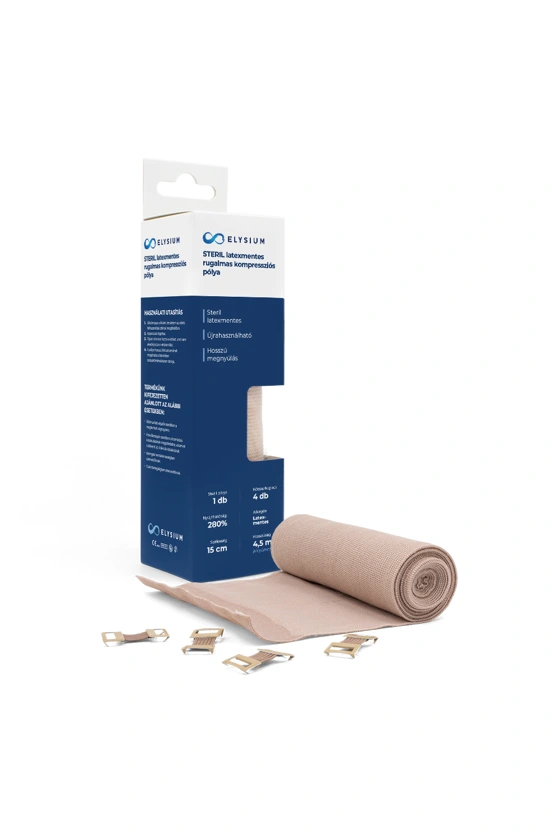 Elysium Rugalmas Kompressziós Pólya multifunkciós pólya – első használatakor steril, ezért akár közvetlenül a nyílt sebfelülettel is érintkezhet; csökkenti a sebfertőződési kockázatot. Alkalmazható trombózis után, krónikus sebek, vénaelégtelenség, vénaműtét kezelésére, valamint védő-, tehermentesítő- és sportkötésként is. Erős kompresszió révén megakadályozza a vér visszaáramlását.