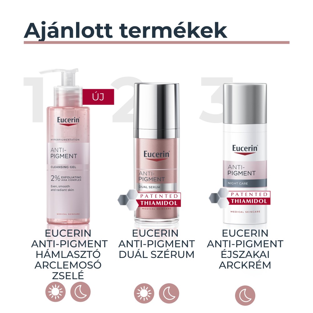 Az Eucerin Anti-Pigment Éjszakai arckrém egy hatékony, szabadalmaztatott hatóanyagot, thiamidolt tartalmaz, mely a hiperpigmentáció kiváltó okára hatva csökkenti a melanintermelést. Klinikailag és bőrgyógyászatilag bizonyított, hogy csökkenti a sötét foltokat és megelőzi újbóli kialakulásukat. Az első eredmények már két hét után láthatók, és rendszeres használat mellett a javulás folyamatos.