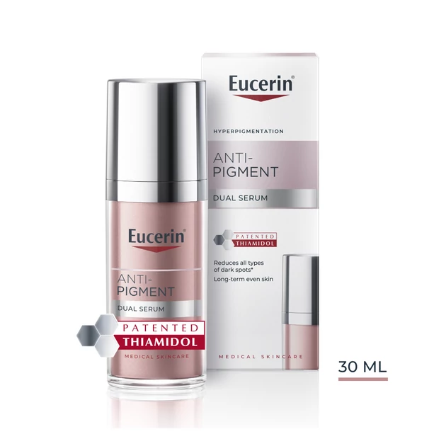 Az ajándékcsomag tartalma: 1db Eucerin Anti-Pigment Duál Szérum 30ml és 1db Eucerin Anti-Pigment nappali arckrém SPF30 50ml egy exkluzív kozmetikai táskában.