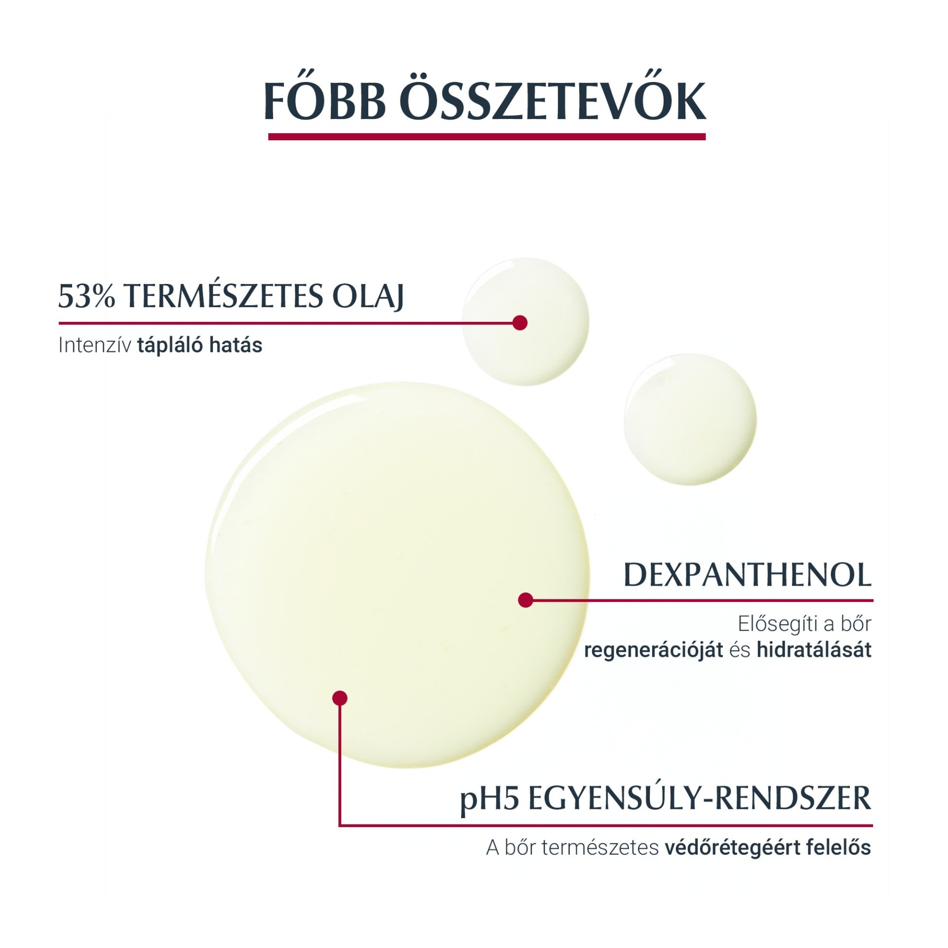Eucerin pH5 olajtusfürdő gazdag természetes ápoló olajokban, amelyek intenzíven feltöltik a bőrt.