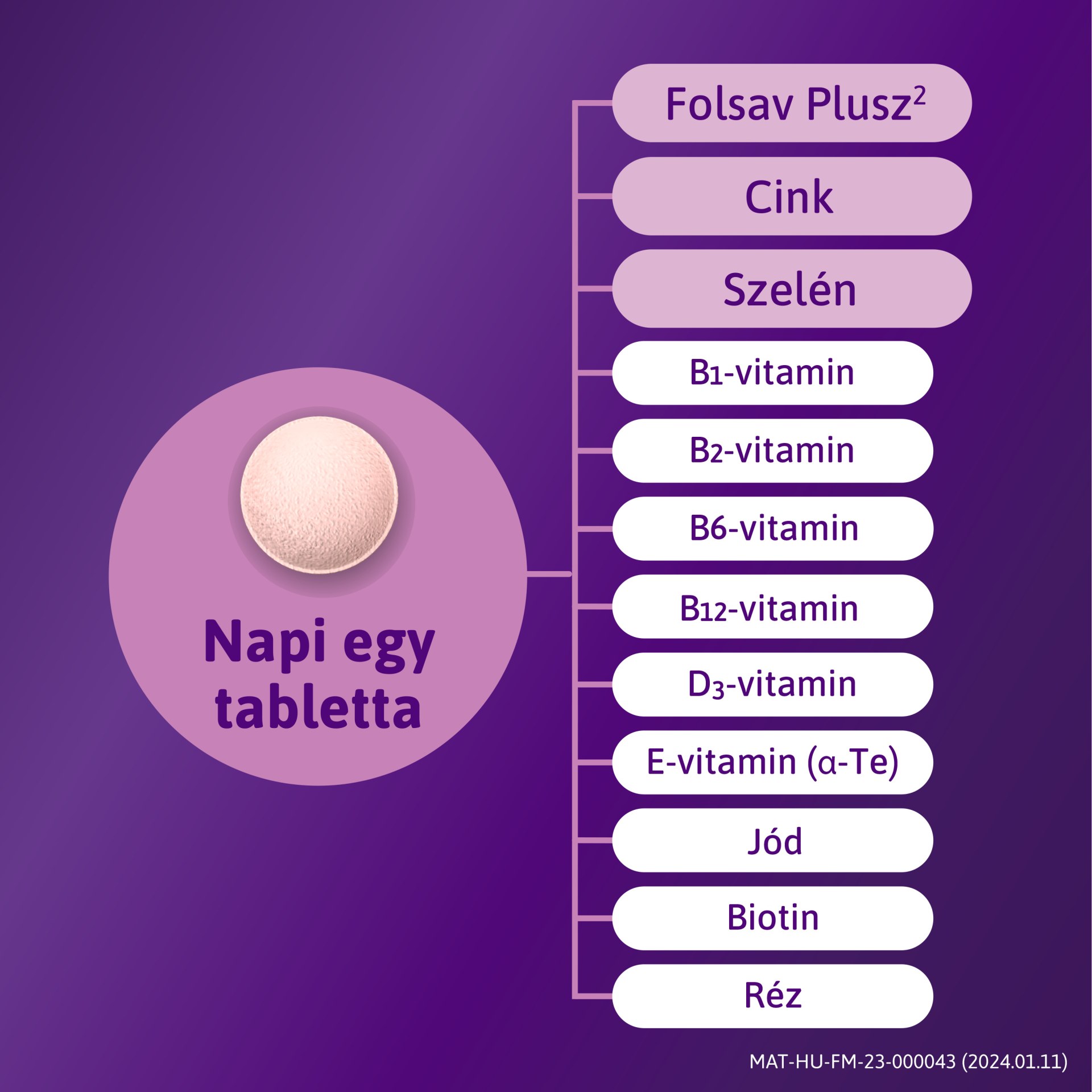 Napi 1 tabletta nagy mennyiségű gondosan válogatott tápanyagokkal, beleértve a cinket a normál termékenység támogatásáért5 és a szelént a sejtvédelem támogatásáért6.. Az adagod könnyű nyomon követése érdekében, a hét napjai szerepelnek a buborékcsomagoláson, így nem fogsz kihagyni egy napot sem. Az 28 filmtablettát tartalmazó csomag 4 hétre elegendő.