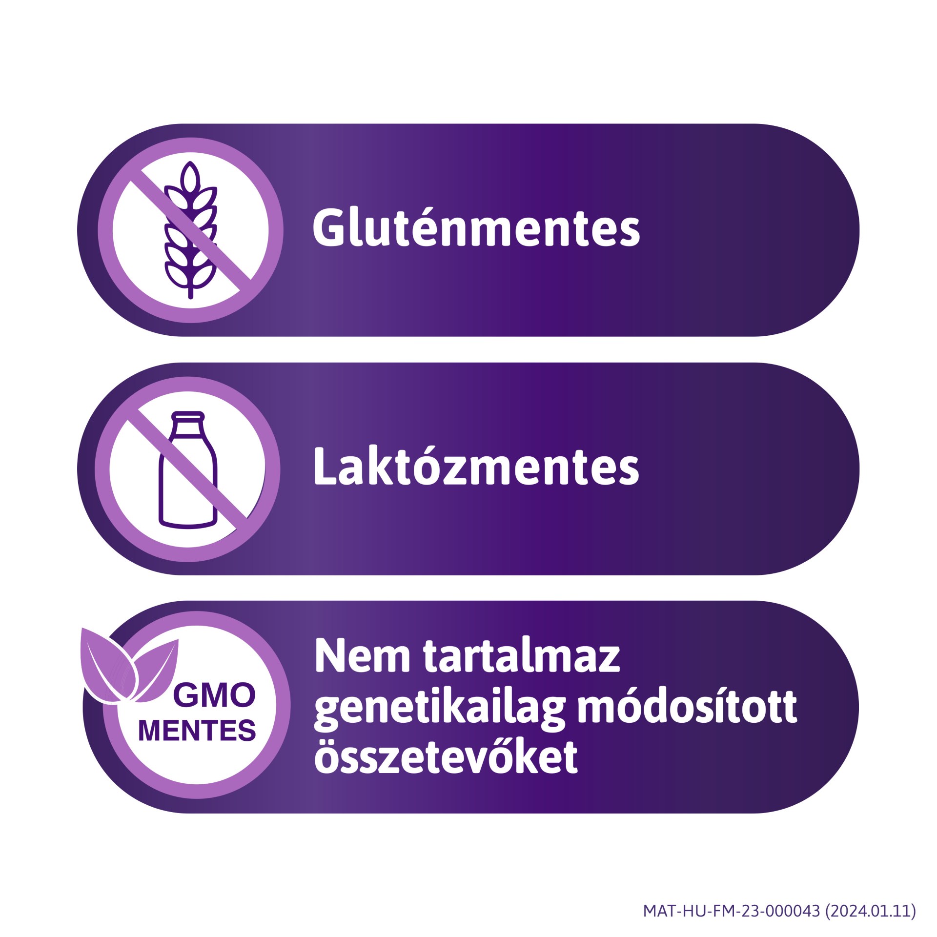 Gluténmentes, laktózmentes, fő allergénektől mentes, GMO-mentes.