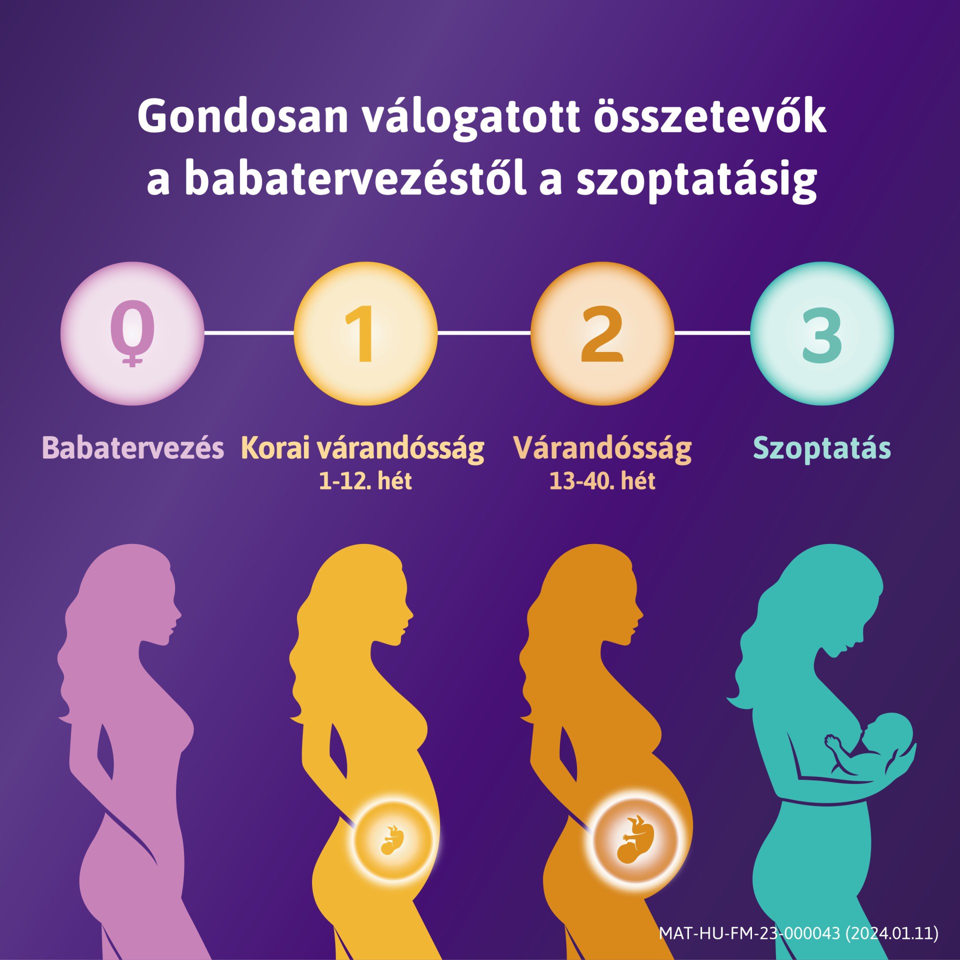 A várandósság ideje alatt a kisbabád egészséges fejlődéséhez¹ különböző tápanyagok szükségesek, beleértve a folsavat is. A Femibion a babatervezéstől a várandósságon át a szoptatási idő végéig, minden egyes fázisra speciális, gondosan válogatott tápanyagokat tartalmaz.