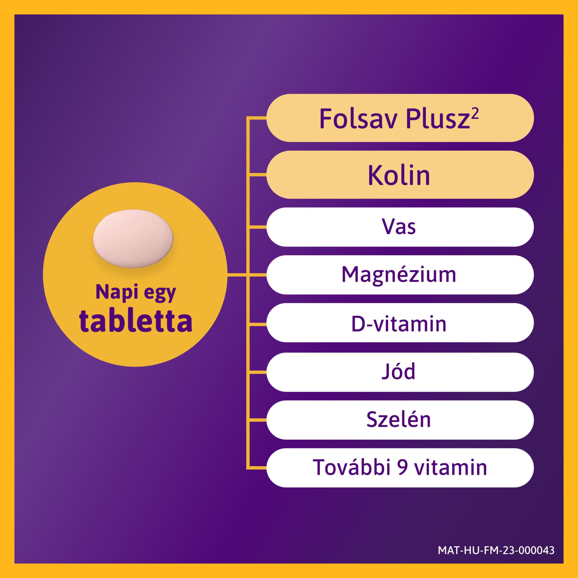 folsav, kalcium-L-metilfolát, jód, B1-, B2-, B6-, B12-, D3-, E-, C-vitamin, biotin, szelén, cink, réz, niacin, pantoténsav, vas, kolin, magnézium