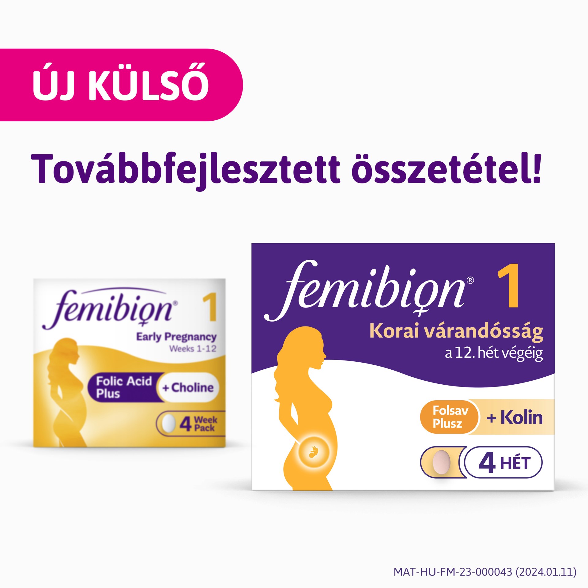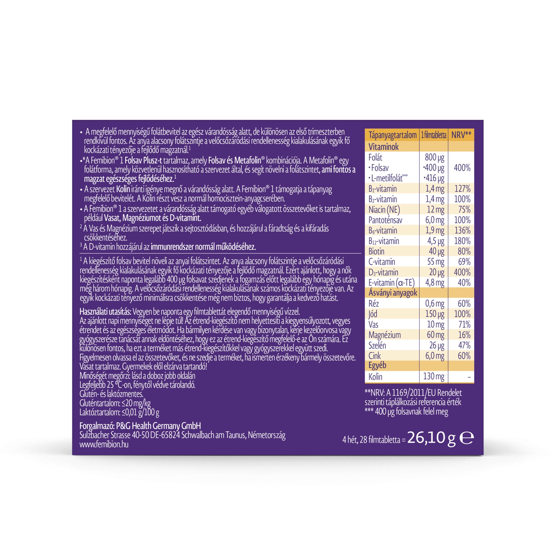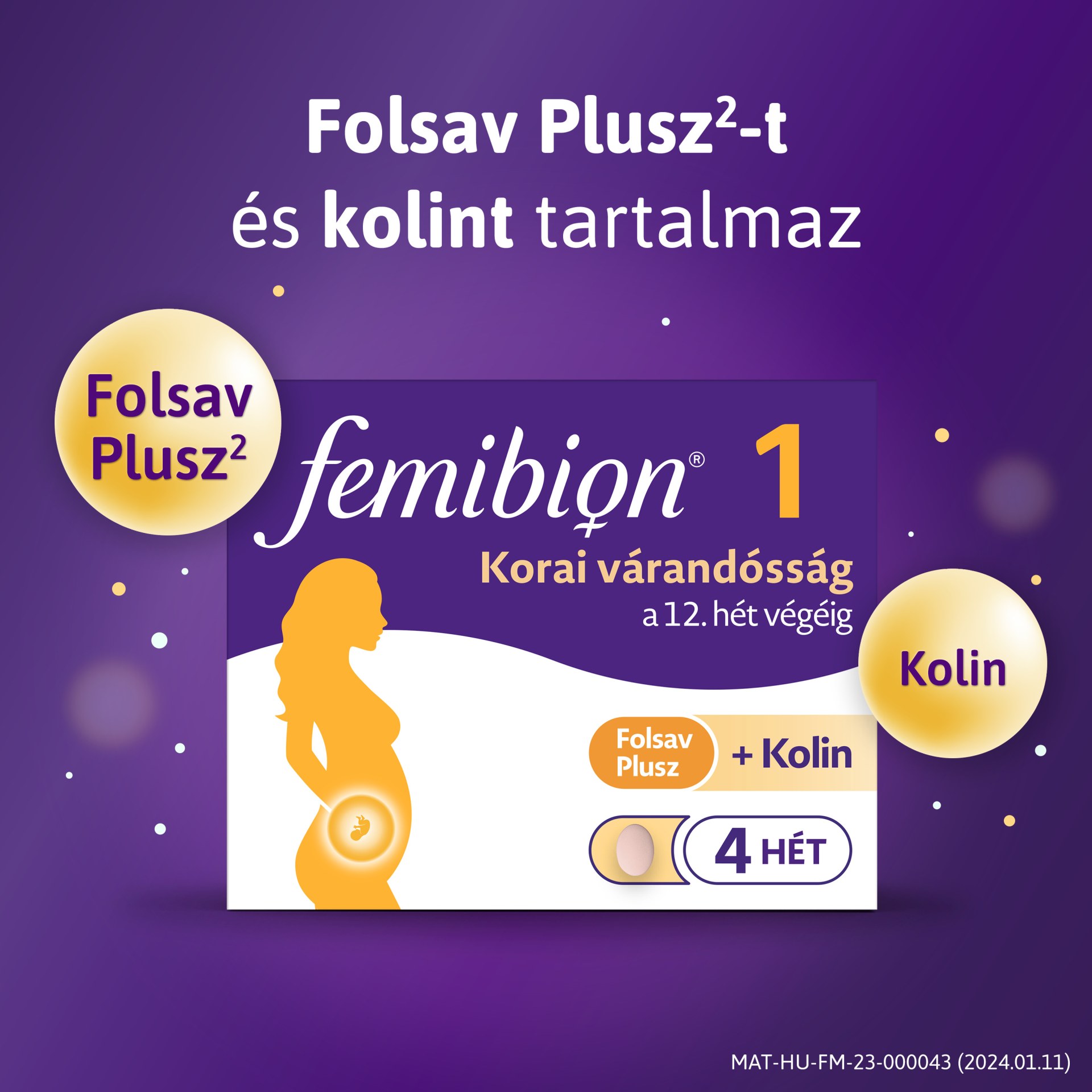 Femibion 1 vitaminkészítmény a várandósság 12. hetének végéig. Folsav Plusz-t (folsav&L-metilfolát), kolint, vasat, D-vitamint és egyéb válogatott tápanyagokat tartalmaz.