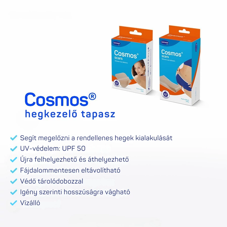 A Hartmann Cosmos szilikon hegtapaszok segítenek megelőzni a rendellenes hegek kialakulását és támogatják a hegek ellaposodását, elhalványítását.