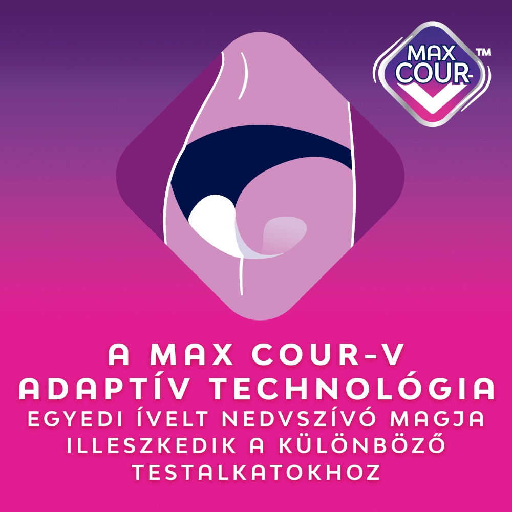 A Libresse éjszakai betétek maximális kényelmét és egyedülálló illeszkedését minden nő élvezheti. A Max Cour-V™ testadaptív technológia egyedi ívelt magját úgy tervezték, hogy szorosan illeszkedjen minden testalkathoz. Ezek az egészségügyi betétek hosszabbak a még nagyobb felületű védelem érdekében.