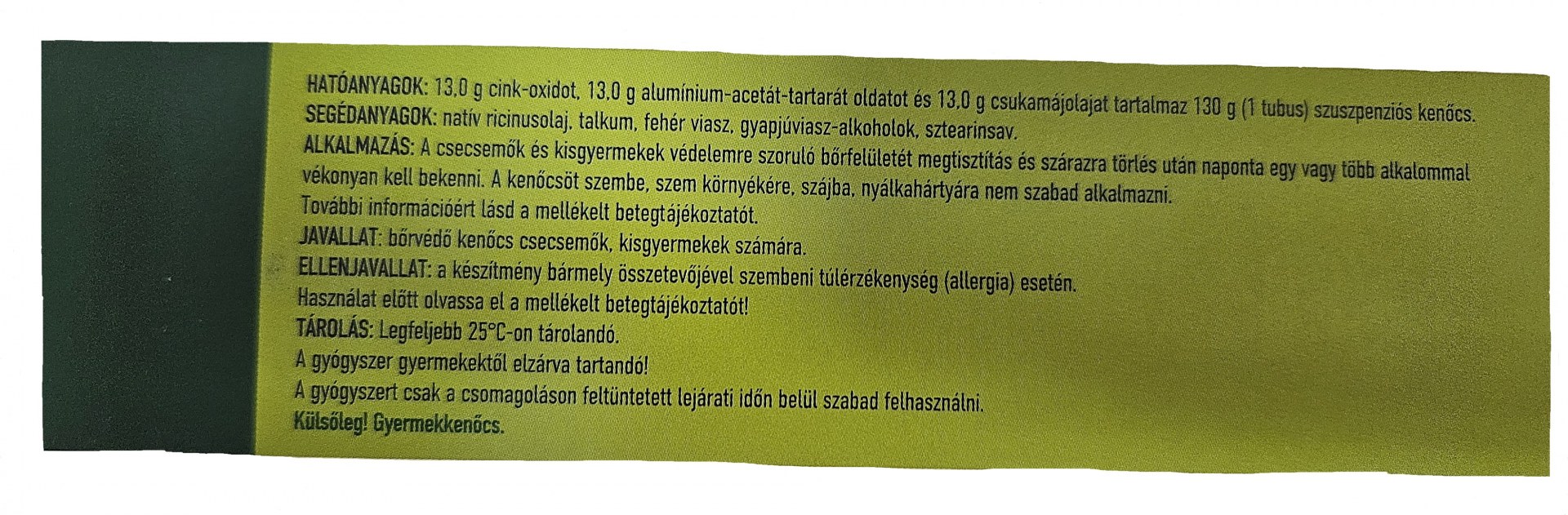 13,0 g cink-oxid, 13,0 g alumínium-acetát-tartarát oldat (tartalmaz: alumínium-szulfát, kalcium-karbonát, borkősav, tömény ecetsav, tisztított víz), 13,0 g csukamájolaj.