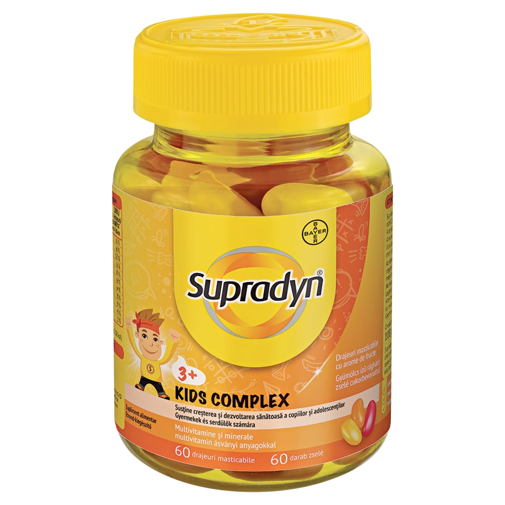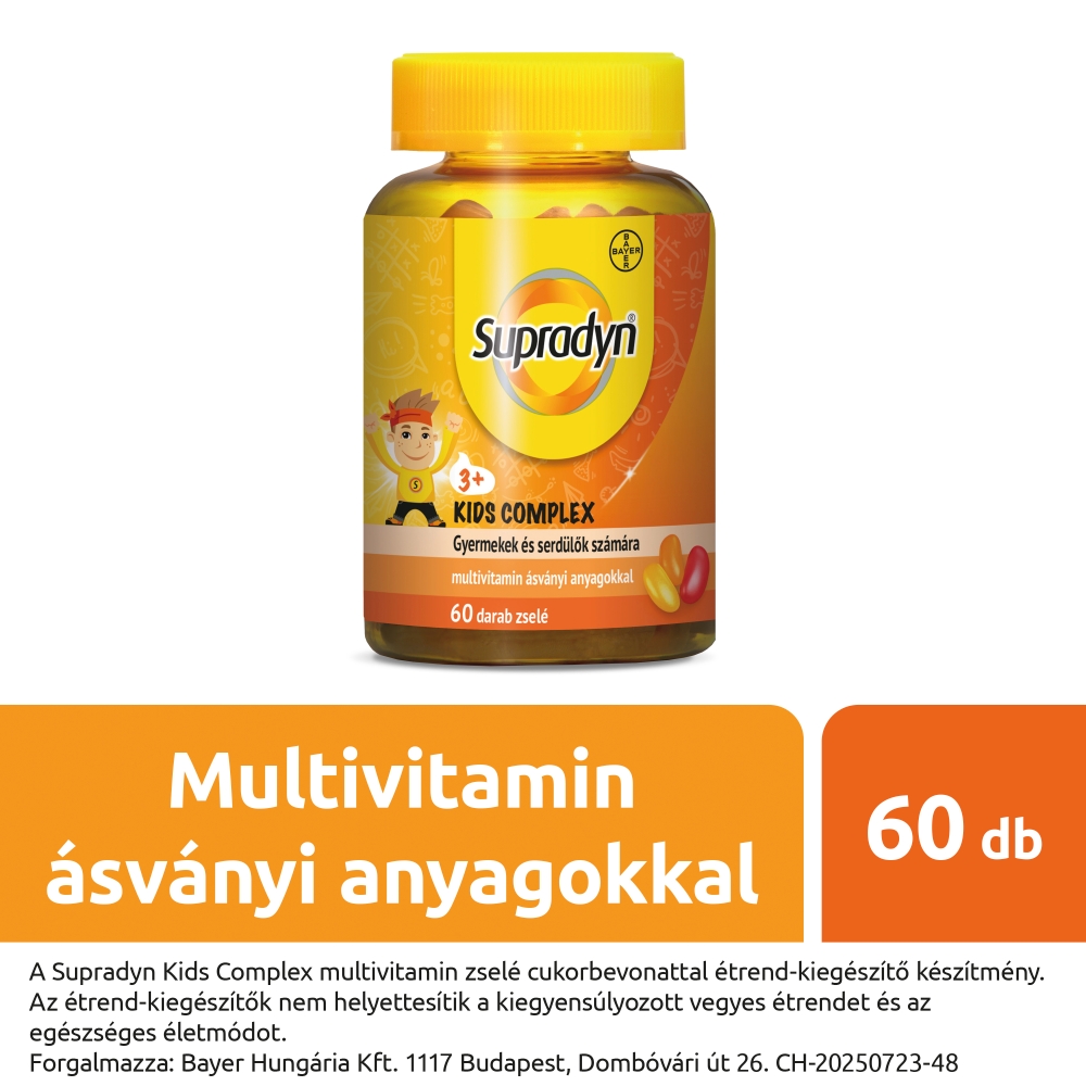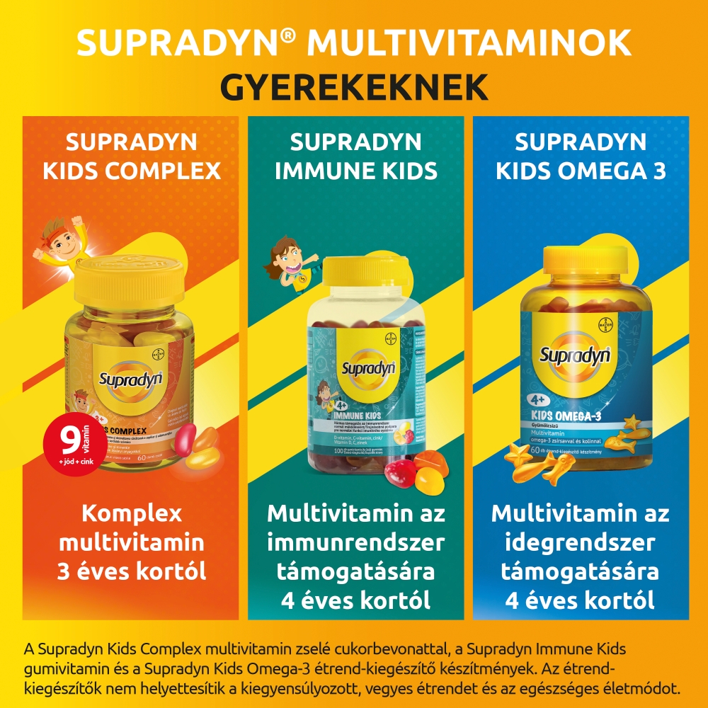A Supradyn Kids Compex multivitamin zselé cukorbevonattal étrend-kiegészítő készítmény. Az étrend-kiegészítők nem helyettesítik a kiegyensúlyozott, vegyes étrendet és az egészséges életmódot.