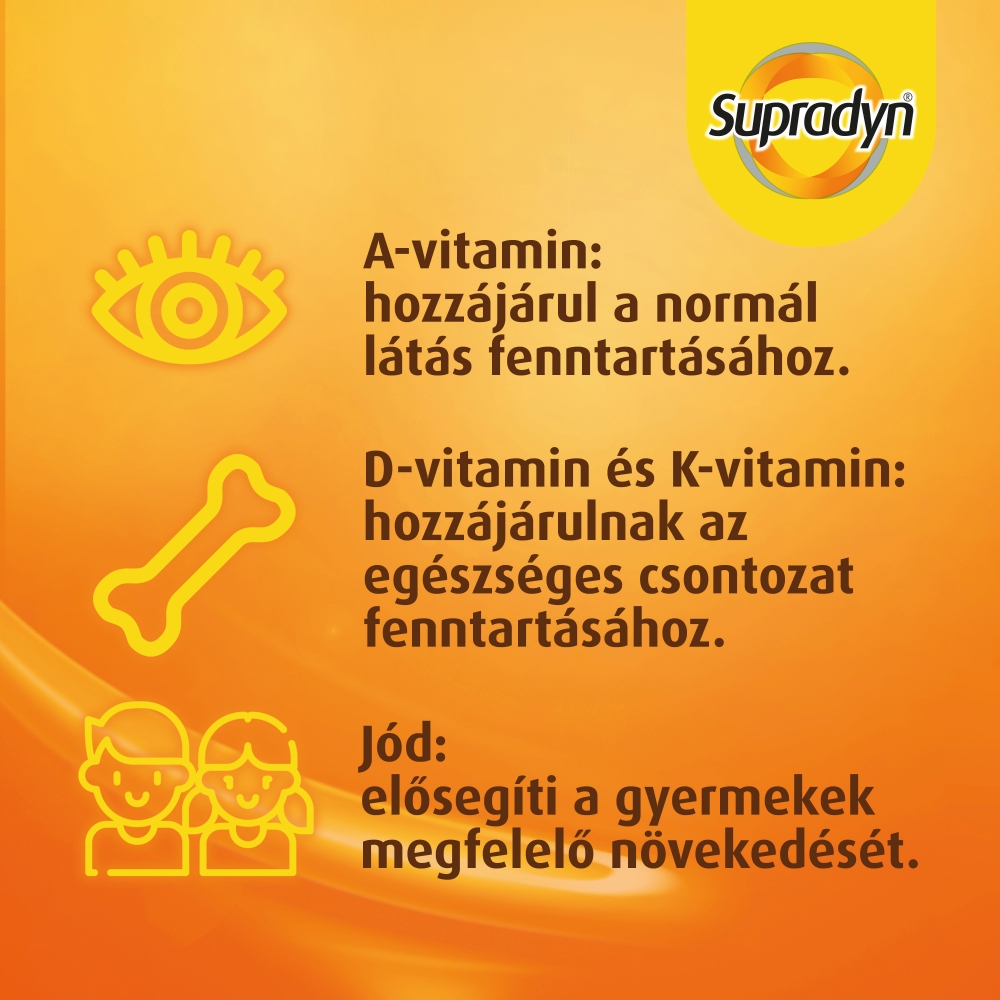 Komplex formula vitaminokkal, jóddal és cinkkel pl. a látás, az egészséges csontozat és a megfelelő növekedés együttes támogatására. A Supradyn Kids Complex-ben található A-vitamin ugyanis hozzájárul a normál látás fenntartásához, a D-vitamin és a K-vitamin hozzájárul az egészséges csontozat fenntartásához, a jód pedig elősegíti a gyermekek megfelelő növekedését.
