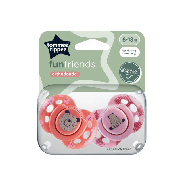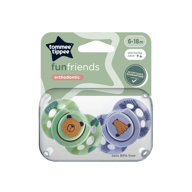 A Tommee Tippee Fun Friends nyugtatócumi 6-18 hónapos kortól, a legszigorúbb irányelveknek és biztonsági szabványoknak megfelelve, többféle méretben, folyamatosan megújuló mintákkal és színekkel készülnek.