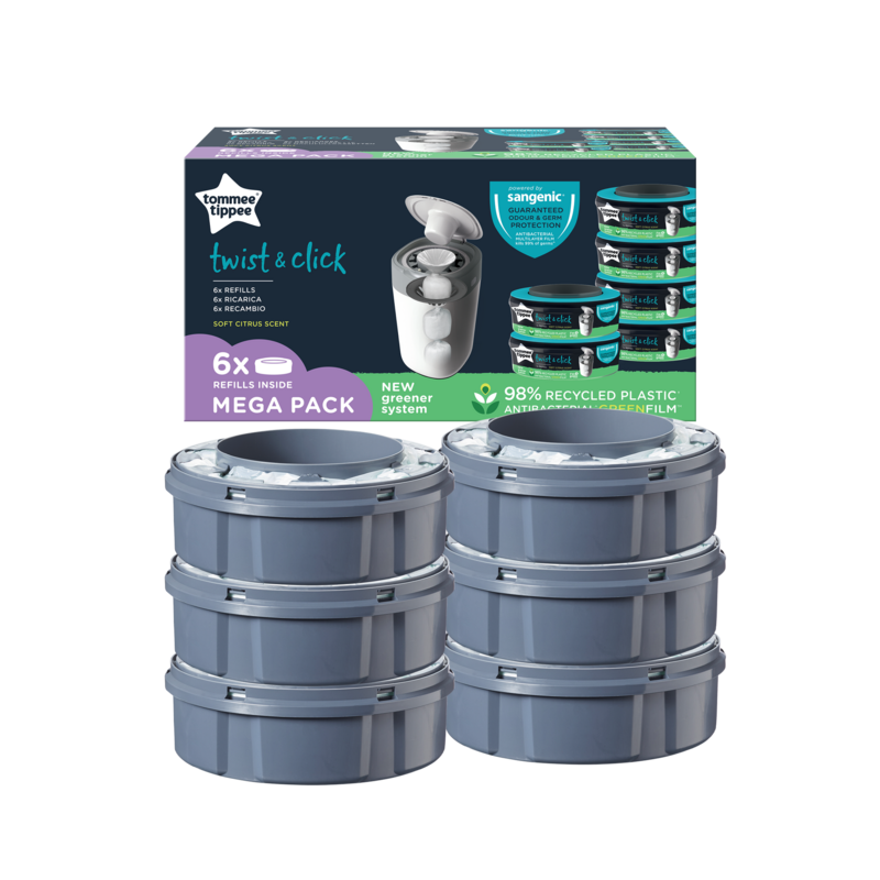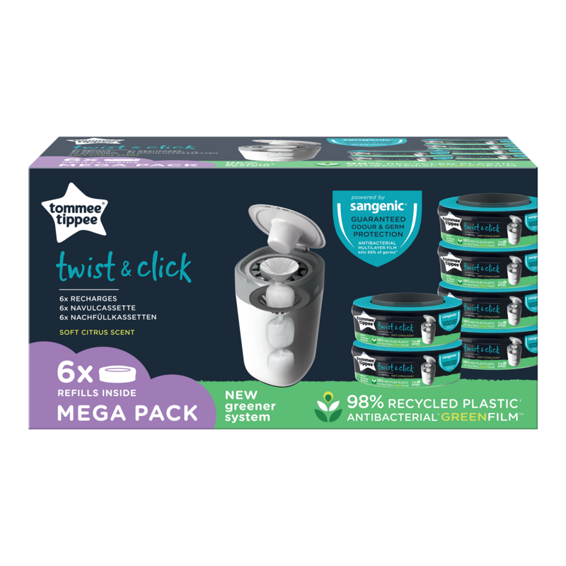 Tommee Tippee Twist & Click és Sangenic Tec pelenkatároló utántöltő kazetta környezetbarátabb kivitelben! A Twist & Click pelenkatárolók és az utántöltő kazetták is 98%-ban újrahasznosított és 100%-ban újrahasznosítható műanyagból készültek, az antibakteriális GREENFILM™ fólia pedig fenntartható forrásból származó cukornádból készült.