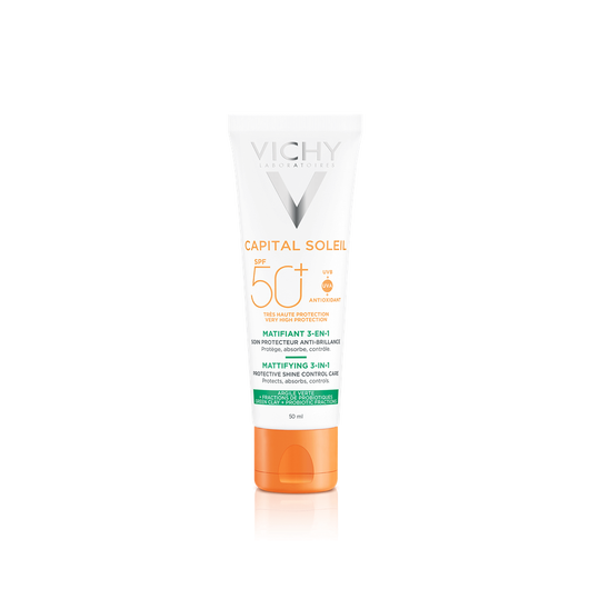 Vichy Capital Soleil Mattító 3-in-1 napvédő krém nagyon magas, széles spektrumú UV-védelem mindennapos használatra. Zöld agyaggal és bifidusz-kivonattal gazdagított összetétel a kifényesedés szabályozásáért a nap során, és az azonnali matt hatásért. Akár 12 órán át tartó tiszta érzés a bőr számára.